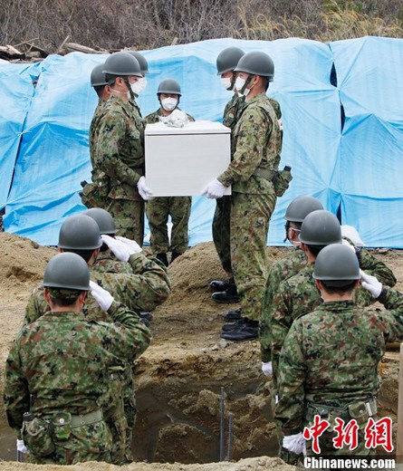 3月22日,日本东北大地震后进入第12天,地震重灾区宫城县东松岛市当天早晨集中埋葬多名遇难者。图为日本地面自卫队人员向即将入土的遇难者致敬。