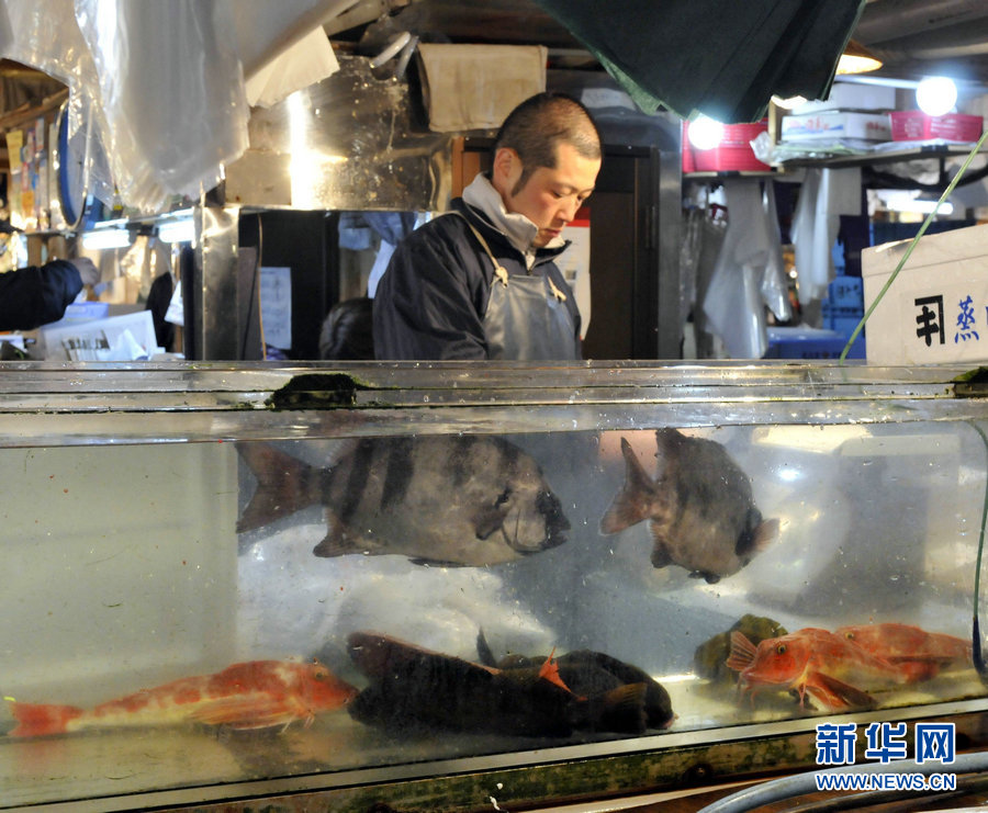 3月23日,一名商贩在日本东京的一个海产品市场工作。日本东京电力公司22日说,福岛第一核电站附近海域的海水被检测出放射性物质含量超标。这表明放射性污染已从陆地、空中扩散至海洋。另外,相关部门对各地辐射剂量、环境和农畜产品受污染情况的监测继续进行。新华社/法新