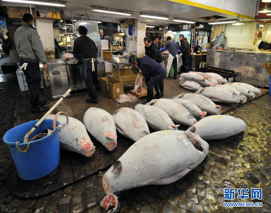 3月23日,在日本东京的一个海产品市场,商贩在切割冻金枪鱼。美国食品和药物管理局22日宣布,受核辐射影响的日本福岛等地区的牛奶和乳制品,以及新鲜果蔬将禁止进入美国销售。海鲜等其他食品仍可进入美国市场,但要先通过辐射检测。新华社/法新