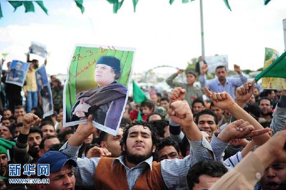 3月23日,在利比亚贝尼沃利德,卡扎菲的支持者们参加示威游行。新华社记者杨光摄