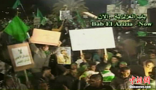 当地时间3月22日晚,多国部队对利比亚发动19日以来的第4轮空袭。22日深夜,利比亚领导人卡扎菲站在他被导弹袭击官邸的阳台上向大批支持者发表演,指责西方国家对利比亚发动的军事行动是“十字军国家对伊斯兰国家发动的新十字军东征”,并且表示他和他的支持者将在对反叛武装和多国部队的战斗中奋战到底,取得最后的胜利。图为利比亚国家电视台的截图。