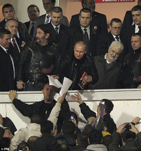 普京和“飞车党”们一起看了俄罗斯顶点俱乐部和斯尔维亚红星俱乐部青年队的足球赛下半场。普京在前排VIP区落座。当有观众叫出他的名字时,这位俄罗斯总理站起来向人群挥手,还接受了签名,引来一片欢呼。