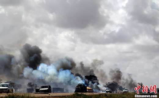 3月20日,班加西附近,忠于卡扎菲的武装力量装备遭遇联军袭击。