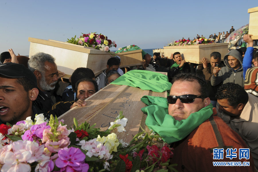 3月24日,在利比亚首都的黎波里,市民抬着即将下葬的棺椁走向一座公墓。 利比亚官方当日宣布,近100名平民在西方联军空袭中丧生。新华社记者杨光摄