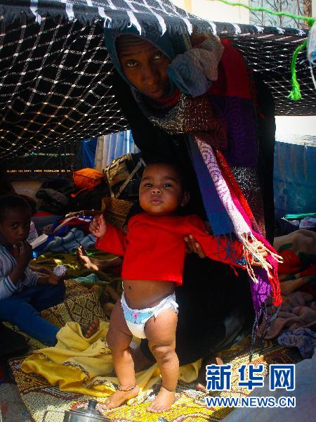 3月28日,在埃及与利比亚边境的塞卢姆口岸,一名母亲带着孩子在简易帐篷里休憩。在利比亚遭到空袭后,利比亚和埃及边境地区开始出现难民潮。大批在利工作的非洲难民聚集在利比亚埃及边境,这些人大多数为乍得人,他们没有合法进入埃及的签证,只好等待国际移民组织或本国政府的救援才能回到祖国。塞卢姆口岸目前仍约有数千名难民滞留。新华社记者才扬摄