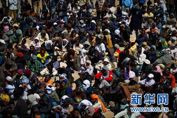 3月28日,在埃及与利比亚边境的塞卢姆口岸,乍得难民等待被运送至港口。在利比亚遭到空袭后,利比亚和埃及边境地区开始出现难民潮。大批在利工作的非洲难民聚集在利比亚埃及边境,这些人大多数为乍得人,他们没有合法进入埃及的签证,只好等待国际移民组织或本国政府的救援才能回到祖国。塞卢姆口岸目前仍约有数千名难民滞留。新华社记者才扬摄