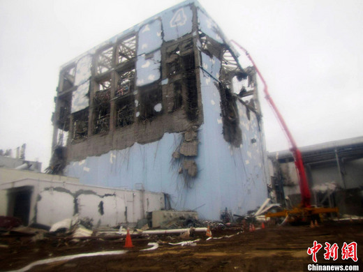 由东京电力公司3月22日拍摄,并于当天公布的图片显示,工作人员正尝试向福岛第一核电站4号反应堆进行喷水作业。
