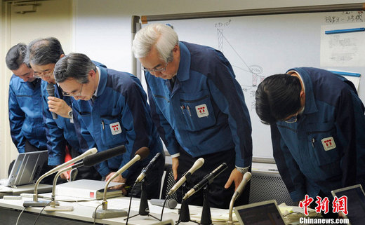 2011年3月28日,东京,东京电力公司召开新闻发布会,通报福岛核电站最新辐射情况,公司高管就“福岛核电站积水辐射超标数值错误”的问题,向民众鞠躬道歉。