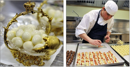 威廉王子与凯特的婚礼当天菜品种类丰富,蓝色画室(Blue Drawing Room)里有30根圆柱,餐桌是当时为拿破仑定制的
