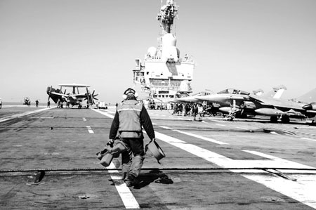 3月25日,一名法国海军技术人员在“戴高乐”号航母上,准备执行对利比亚的军事任务。