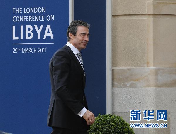 3月29日,在英国首都伦敦,北约秘书长拉斯姆森抵达利比亚问题国际会议会场。利比亚问题国际会议当日在伦敦召开,40多位国际组织代表和有关国家外长在会议上对利比亚局势进行讨论,评估联合国安理会决议执行情况,以推进利比亚政治进程。新华社记者曾毅摄