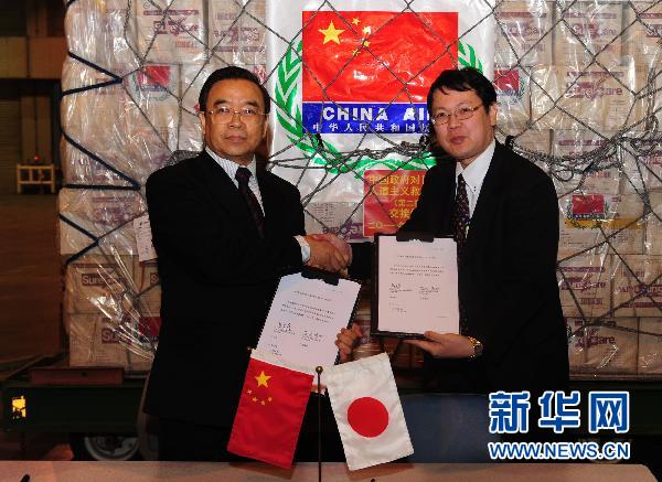 3月28日晚,在日本东京成田机场,中国驻日大使馆公使吕克俭(左)和日本外务省亚洲大洋洲局日中经济室室长古谷德郎在现场举行交接仪式。当晚,中国援助日本的第二批救援物资运抵日本成田机场。此批物资包括6万瓶矿泉水和325万副橡胶手套,共计96吨、473立方米,将于今晚运往茨城县等地震灾区。新华社记者 季春鹏 摄