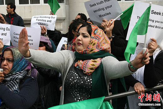 当地时间3月29日下午,约40个国家和国际组织的外长及代表在伦敦参加有关利比亚局势的国际会议,上百名居住在伦敦的利比亚、卡塔尔等国抗议者在兰卡斯特宫会场外示威,要求西方国家停止轰炸,停止干涉利比亚内政。中新社发 魏群 摄