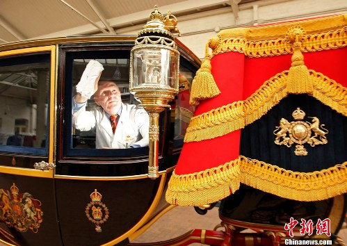 目前,威廉王子的婚礼正在有条不紊的筹备中。图为工作人员擦拭将威廉王子大婚时使用的马车。