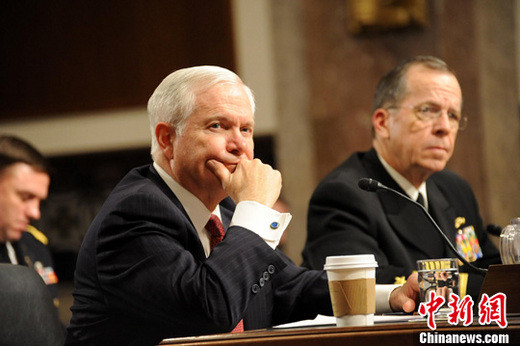 美国国防部长罗伯特·盖茨、美军参谋长联席会议主席迈克尔·马伦31日上午和下午分别前往国会参、众两院作证,为美国对利比亚动武辩护。图为盖茨(左)与马伦当日出席参议院军事委员会的听证会。中新社发 吴庆才 摄