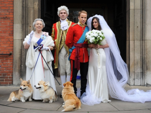 据报道,当天一架华丽的马车载着身着盛装的“英国女王”、“威廉王子”和他的“准王妃凯特”,现身伦敦市中心的皮卡迪利广场(Piccadilly Circus ),立刻引起了周围群众的关注。只见在“皇家随从”的护卫下,神似“本尊”的三人在街头行走,并在教堂前摆出姿势,供围观者拍照留念。“英国女王”还牵着三只小狗,就像真正的女王一样。