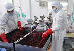 中国江苏菜华食品公司加紧生产出口日本的紫苏腌茄子。摄于3月31日。(共同社)
