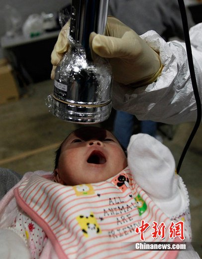 2011年3月31日,日本福岛县一个避难所内,出生于3月15日婴儿Nagashima Rio正在接受核辐射检测。她所在的避难所距离福岛第一核电站大约70公里。而他所出生的医院距离福岛第一核电站只有约50公里。