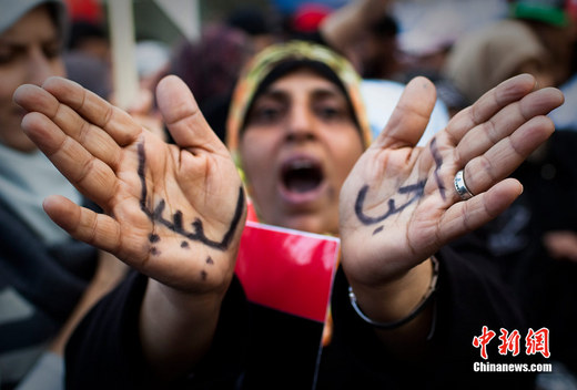 2011年3月23日,利比亚东部城市班加西,在一个支持多国部队空袭利比亚的活动中,一个女人举起写着“我爱利比亚”的双手。