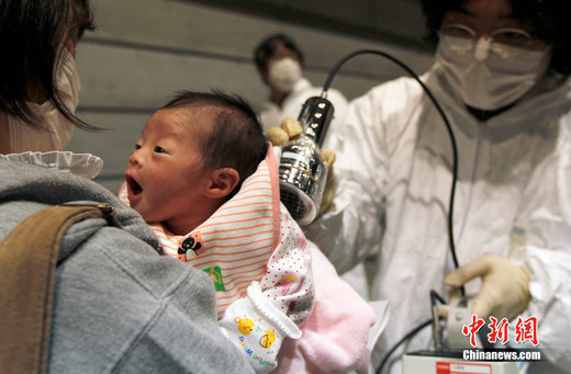 2011年3月31日,日本福岛县一个避难所内,出生于3月15日婴儿Nagashima Rio正在接受核辐射检测。她所在的避难所距离福岛第一核电站大约70公里。而他所出生的医院距离福岛第一核电站只有约50公里。