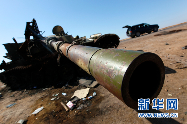 4月5日,在利比亚布雷加前线附近,一辆被摧毁的政府军坦克。利比亚领导人卡扎菲的部队与反政府武装5日在利比亚东部小镇布雷加交火,失去北约战机空中掩护的反政府武装不敌卡扎菲部队,被迫后撤。新华社记者才扬摄