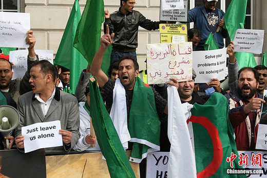 当地时间3月29日下午,约40个国家和国际组织的外长及代表在伦敦参加有关利比亚局势的国际会议,上百名居住在伦敦的利比亚、卡塔尔等国抗议者在兰卡斯特宫会场外示威,要求西方国家停止轰炸,停止干涉利比亚内政。中新社发 魏群 摄