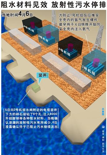 东京电力公司2日发现高放射性的污水从2号机组水闸附近电缆竖井的裂缝中流入海中,灌注混凝土以及吸水膨胀的高分子材料等封堵方法都未能奏效。5日,东京电力公司在电缆竖井下方碎石层中开凿8个孔,注入6000升俗称“水玻璃”的硅酸钠等各种阻水材料,当晚确认泄漏的放射性污水量减少,6日早晨确认污水已停止外泄。