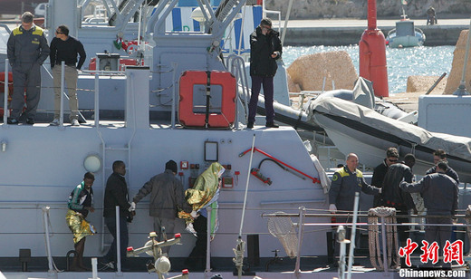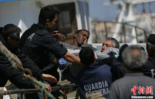 4月6日凌晨,一艘从利比亚出发的难民船在意大利西西里岛以南海域倾翻,目前约有150至200人失踪,至少15人遇难。当地救援人员目前已经成功营救47名幸存者,其中包括一名孕妇。图为幸存难民在当地救援人员的帮助下抵达意大利兰佩杜萨岛。