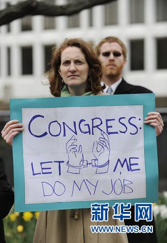 4月8日,在美国首都华盛顿国务院外,美国外交官举着标语牌,抗议联邦政府被迫关门。目前,美两党尚未就政府预算案达成协议,联邦政府在8日临时预算到期后关门风险增大。如果政府关门,大约80万公务员将“放大假”,受影响的包括白宫、各部委、国会和联邦法院,美军军饷也将停发。与此同时,所有国家公园、史密森学会博物馆等都将关门,大多数政府部门网站将停止更新。新华社记者张军摄