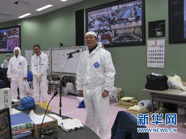 这张日本经济产业省4月9日提供的照片显示,日本经济产业大臣海江田万里(右)当天在福岛第一核电站视察时向东京电力公司员工发表讲话。新华社/路透