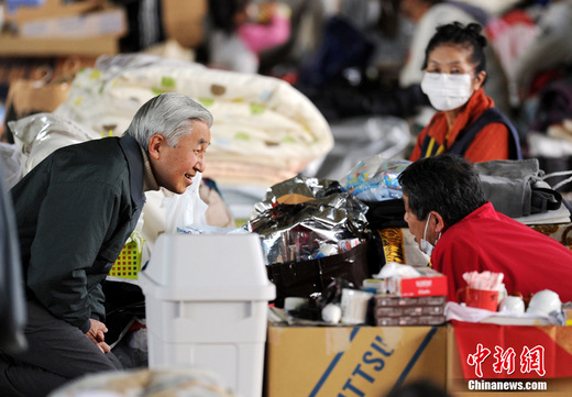 4月8日,日本天皇和皇后在避难所探望因核电站事故而从福岛县双叶町疏散到埼玉县的灾民。