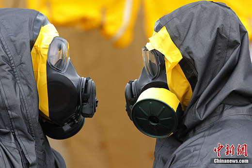 4月9日,日本东京,美国海军陆战队的化学生物事件快速反应部队在横田空军基地进行除污演练。