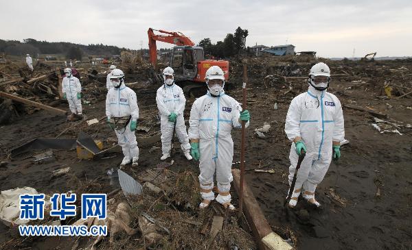 4月11日,在日本福岛县南相马灾区,在此搜寻遇难者遗体的警察向遇难者默哀。日本发生大地震和海啸至今已满一个月。根据日本警视厅11日早公布的数字,目前仍有超过1.4万人失踪。 新华社/路透