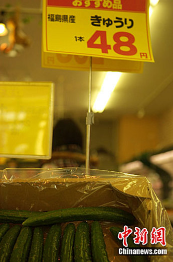 3月29日,在福岛县二松本市一家超市,福岛县本地产的蔬菜销售大幅减少,仅有黄瓜和萝卜以及草莓摆上柜台。据超市员工介绍,诸如牛奶和菠菜等都已下架。中新社发 孙冉 摄