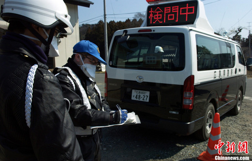 3月30日,记者驾车准备前往距离福岛第一核电站30公里的南相马市。刚一进入南相马市境内,就被3名全副武装的警察拦了下来。这3名警察来自广岛,他们奉命在此提醒每一位路过的车辆,由此进入30公里半径范围,有核辐射的可能。据警察介绍,在30公里半径范围有数个这样的关卡,而在20公里半径,这样的关卡更加密集。图为执行警示任务的广岛警察。中新社发 孙冉 摄