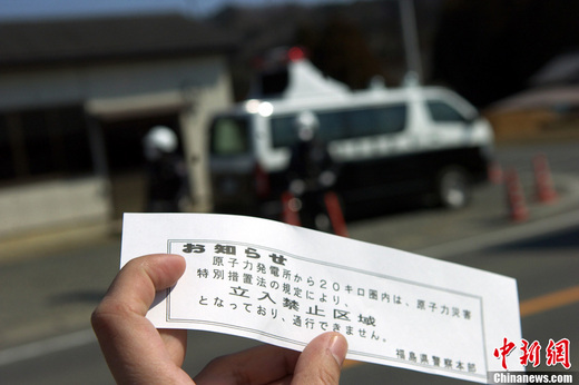 3月30日,距离福岛第一核电站30公里的南相马市,警察奉命提醒路过车辆,由此进入30公里半径范围,有核辐射的可能。中新社发 孙冉 摄