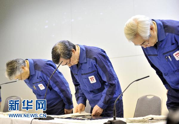 4月13日,在日本东京电力公司总部,东京电力公司社长清水正孝(中)及两名副社长在新闻发布会上鞠躬致歉。当日,东电在东京总部召开新闻发布会,社长清水正孝在发布会上就福岛核危机向公众致歉。 新华社/法新