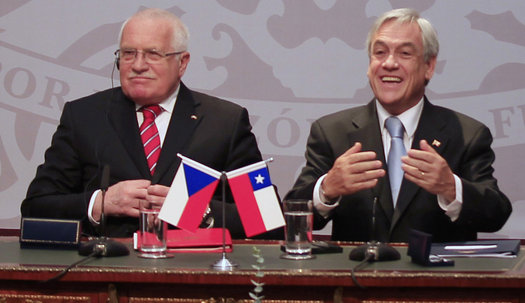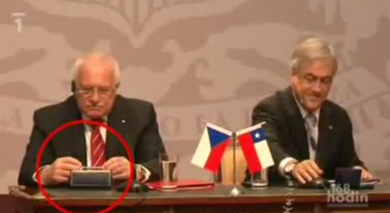 据报道,一段网上热播的视频显示,捷克总统瓦茨拉夫?克劳斯上周访问智利期间,在与智利总统皮涅拉会面的新闻发布会上,“顺手牵羊”拿走了会场提供的一支笔。据称,当皮涅拉发表欢迎辞时,坐在左边的克劳斯打开了放在面前桌子上的一个笔盒,拿出一支笔摩挲一番,随后拿着笔把手缩回桌子下,把笔偷偷放进外套。最后,他两手恐空空放到桌子上,并重新盖上钢笔盒。视频用红色箭头和圆圈标出了克劳斯藏笔的全过程。