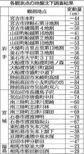 据悉,其中地盘下降程度最大的是岩手县陆前高田市,为84厘米。宫城县石卷市下沉78厘米,气仙沼市下沉74厘米,大船渡73厘米。上个月地理院发表,由于牡鹿半岛向东南东方向移动了5.3米之后下沉1.2米。