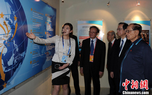 4月15日,博鳌亚洲论坛2011年年会举办“博鳌十年图片展”。图为论坛前理事长、菲律宾前总统拉莫斯(右一),论坛现任理事长、日本前首相福田康夫(右二)一起观看展示博鳌亚洲论坛十年时间从亚洲走向世界的图画。中新社发 尹海明 摄
