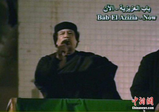 当地时间3月22日晚,多国部队对利比亚发动19日以来的第4轮空袭。22日深夜,利比亚领导人卡扎菲站在他被导弹袭击官邸的阳台上向大批支持者发表演,指责西方国家对利比亚发动的军事行动是“十字军国家对伊斯兰国家发动的新十字军东征”,并且表示他和他的支持者将在对反叛武装和多国部队的战斗中奋战到底,取得最后的胜利。图为利比亚国家电视台的截图。