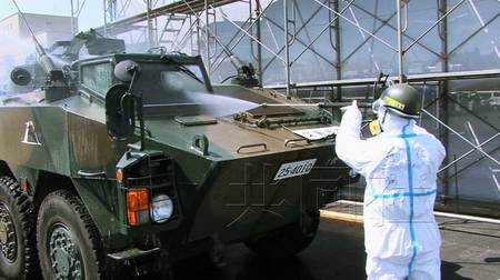 录像中,日本自卫队员正在对装甲车进行去污作业。12日摄于福岛县广野町的核事故处置中心“J-Village”。图片由自卫队提供。(共同社)