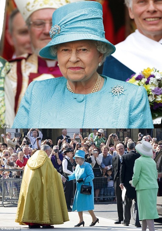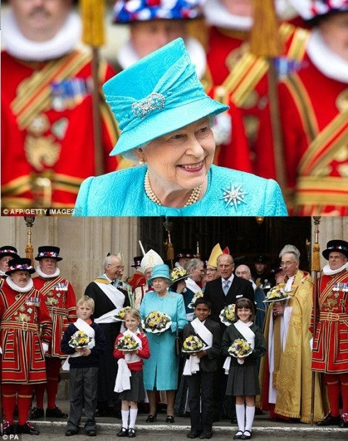 据报道,身穿天蓝色套装的英国女王伊丽莎白二世在爱丁堡公爵、丈夫菲利普亲王的陪同下,出现在一周后威廉王子即将举行婚礼的伦敦西敏寺大教堂,身后跟随着仪仗队和高级神职人员代表团。
