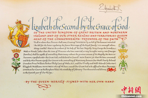 当地时间4月21日,英国女王官方同意威廉王子迎娶凯特-米德尔顿的官方文书发布。