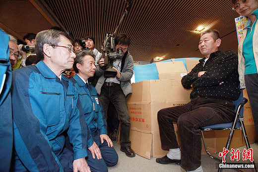 当地时间2011年4月22日,日本福岛县,东京电力社长清水正孝到避难所向灾民跪地鞠躬谢罪,遭到灾民怒斥。