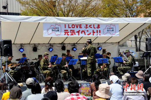 4月24日,日本福岛市街头一处小广场上,日本自卫队军乐队举行“我爱福岛”主题演奏会,一曲“不要放弃,不怕失败”的曲子在现场引起共鸣。中新社记者 孙自法 摄