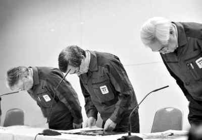 4月13日,在日本东京电力公司总部,东京电力公司社长清水正孝(中)及两名副社长在新闻发布会上鞠躬致歉。当天,东电在东京总部召开新闻发布会,社长清水正孝在发布会上就福岛核危机向公众致歉。 新华社/法新