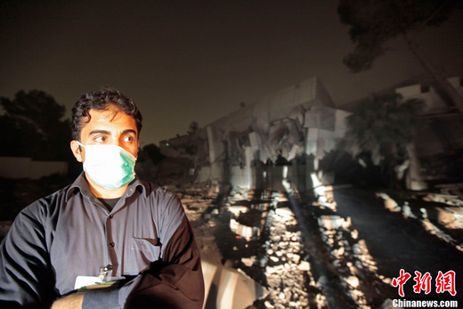 4月25日,在利比亚首都的黎波里,一名男子站在被轰炸的利比亚领导人卡扎菲的官邸前。北约战机25日凌晨对利比亚领导人卡扎菲在的黎波里的官邸实施轰炸。利比亚政府官员谴责北约企图杀害卡扎菲。