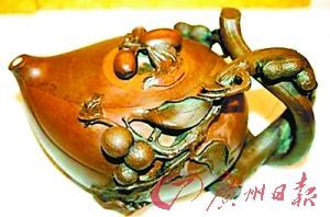 《早生贵子》澄泥石壶高12厘米,长18厘米,宽15厘米。在创作中特别设计了中国传统婚礼中最常见的红枣、花生、桂圆三种吉祥物,寓意“早生贵子”。