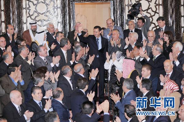 资料图片 3月30日,叙利亚总统巴沙尔(后中)在叙人民议会致意。新华社/叙利亚通讯社